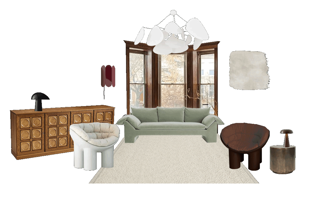 Interior renovation of an existing Sitting Room, Hallway and Master Bedroom in Glasgow, Scotland. The interior features Bauwerk lime wash walls, a peat brown Roly Poly chair designed by Faye Toogood and a 1970’s Belgian Brutalist Oak Sideboard by Gerhard Bartels.